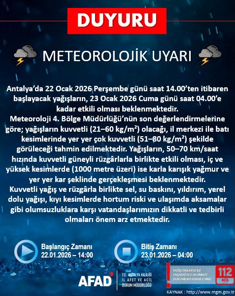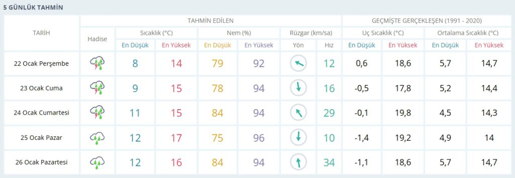 Özellikle 22 Ocak Perşembe ve 23 Ocak Cuma günleri gök gürültülü sağanak yağış beklenmektedir. Yağışların haftanın devamında da etkisini sürdüreceği tahmin edilmektedir.